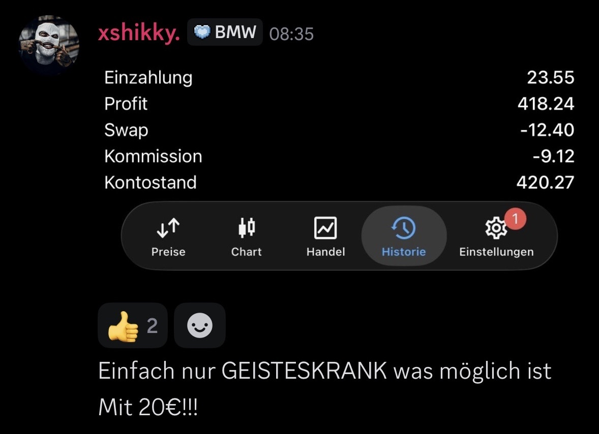 Trotzdem hat er den ersten Schritt gemacht.➡️ Start mit nur 20€ Kapital ➡️ auf über 400€ hochgetradet ➡️ innerhalb von 3 Monaten Zusammenarbeit über 3.500€ Profit erzielt
